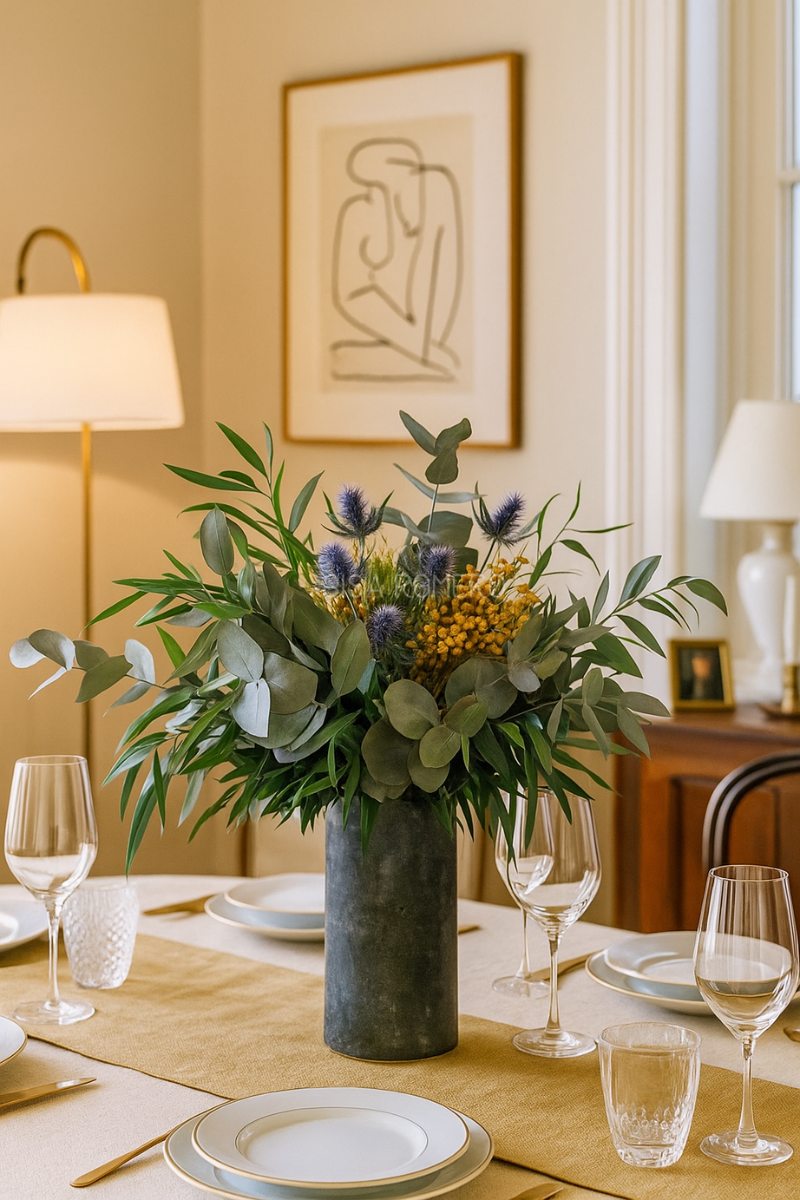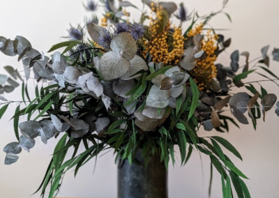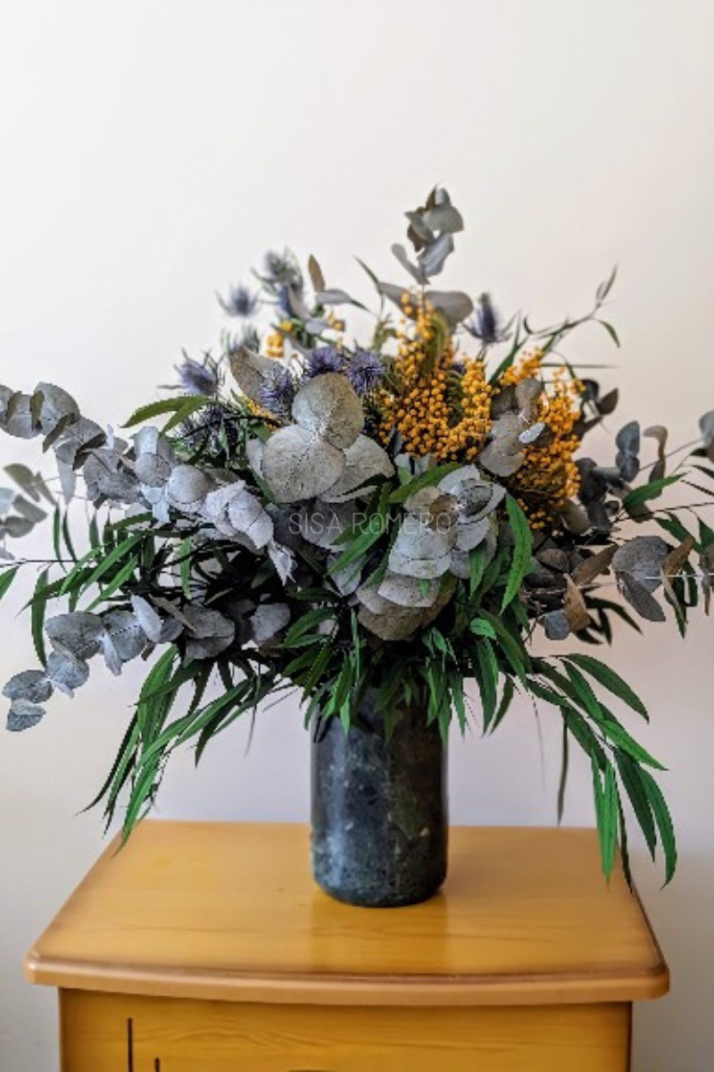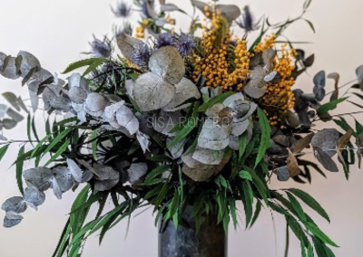 Ramo de Eucalipto, Mimosa y Cardo Preservados – Decoración Natural y Elegante, en un ramo preservado voluminoso y lleno de vida