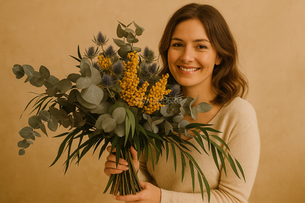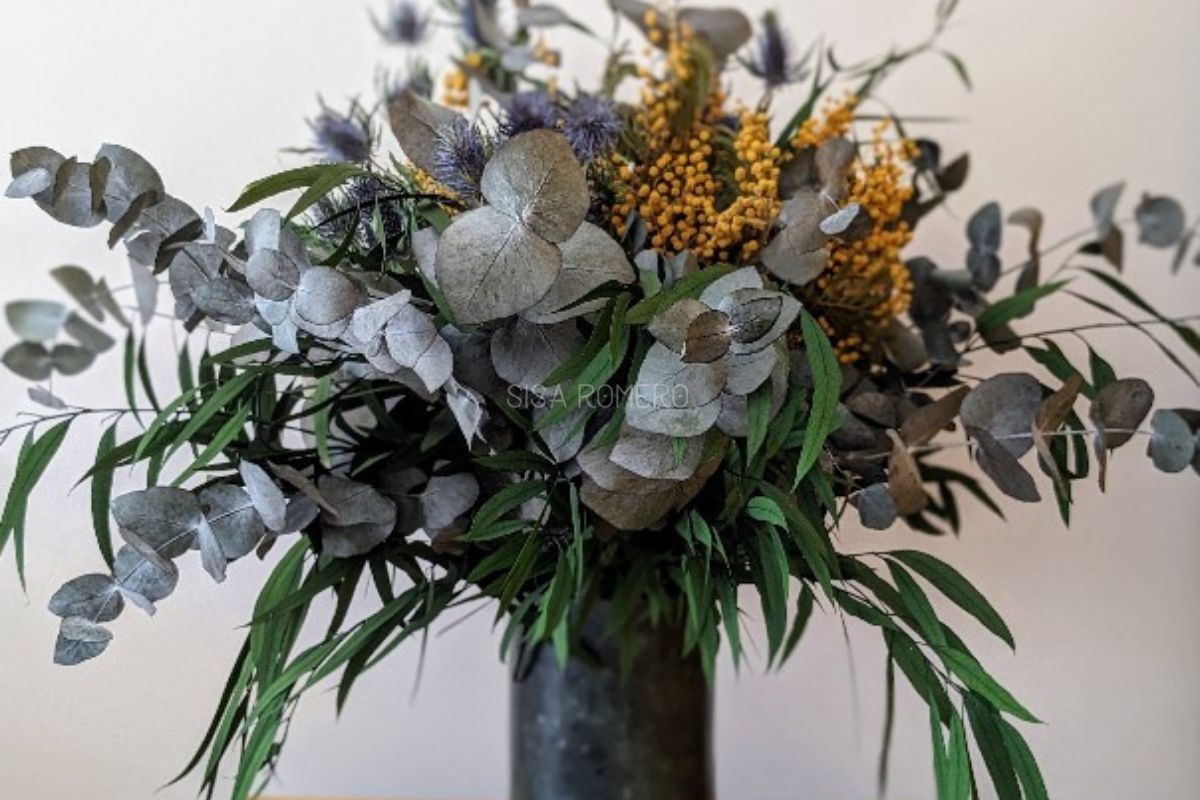 El ramo “Bosque Dorado” combina la elegancia atemporal del eucalipto preservado con la luminosidad de la mimosa amarilla y la fuerza cromática del cardo azul. Un juego de colores y texturas que aporta frescura, estilo y un aire silvestre único a cualquier espacio.