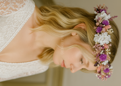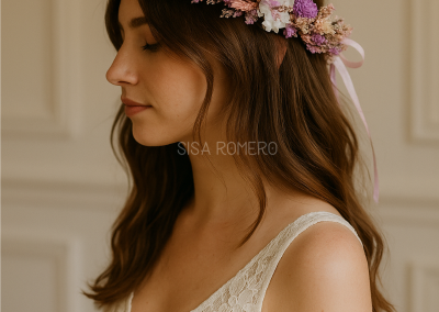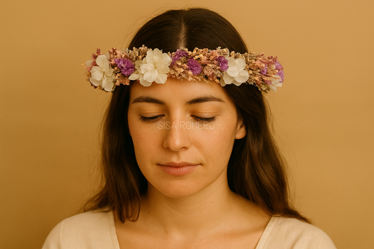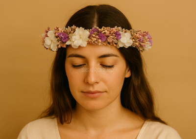 Nuestra corona de flores preservadas en tonos blancos, lilas y rosas es la elección perfecta para novias, damas de honor e invitadas que buscan un accesorio romántico, elegante y duradero.