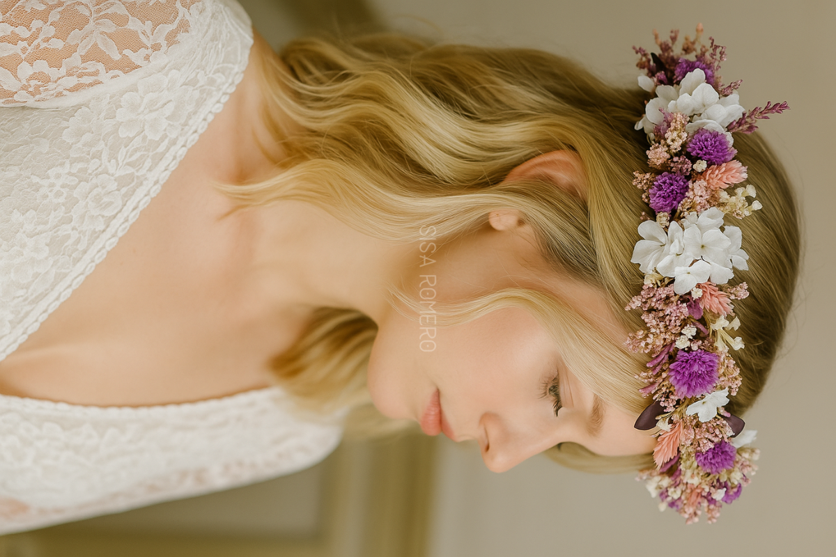Elaborada a mano con flores naturales preservadas, combina la frescura de los tonos claros con la suavidad de los lilas, creando un diseño delicado y atemporal. Ideal para bodas bohemias, campestres o románticas, así como para sesiones de fotos y eventos especiales.