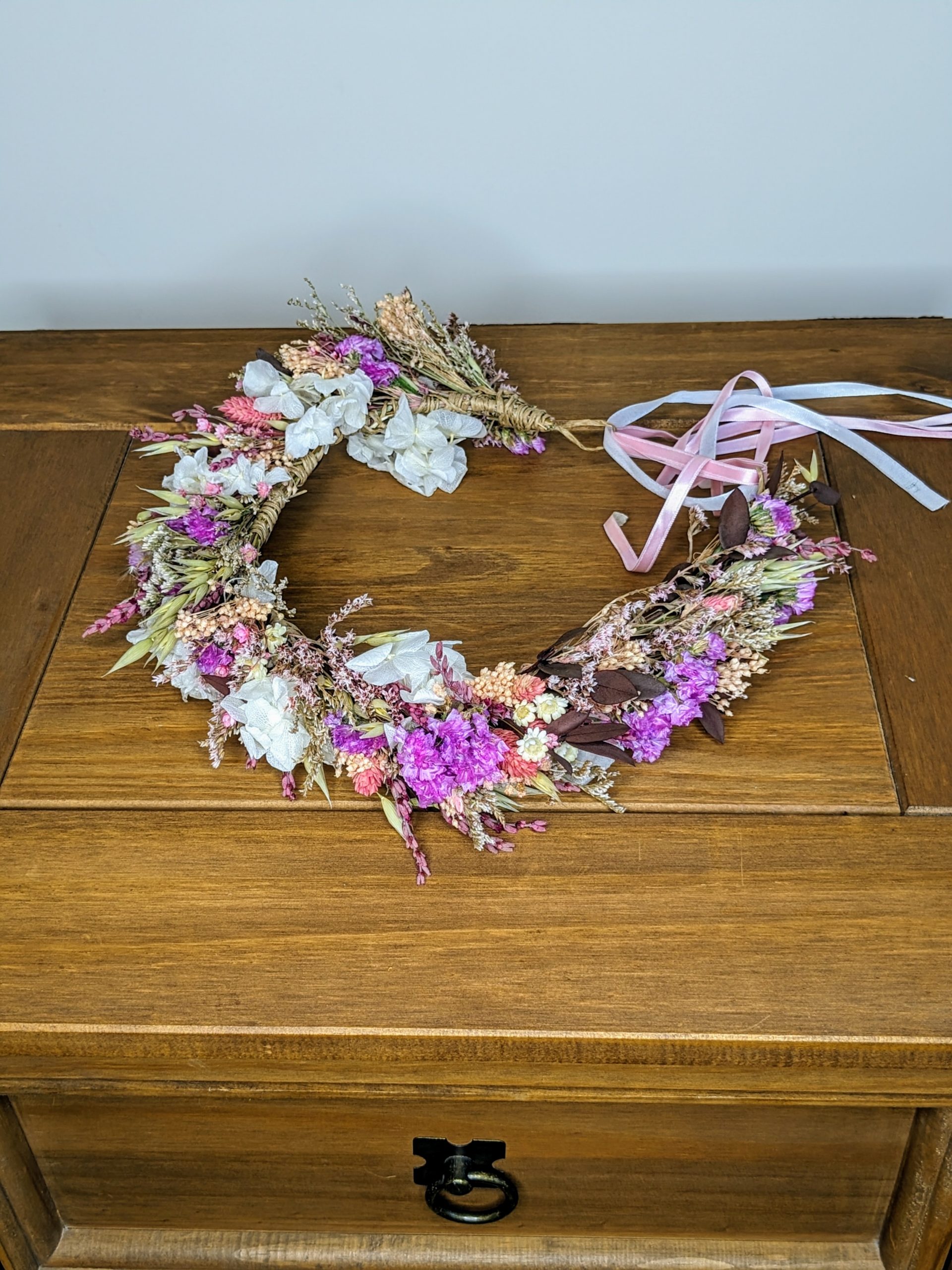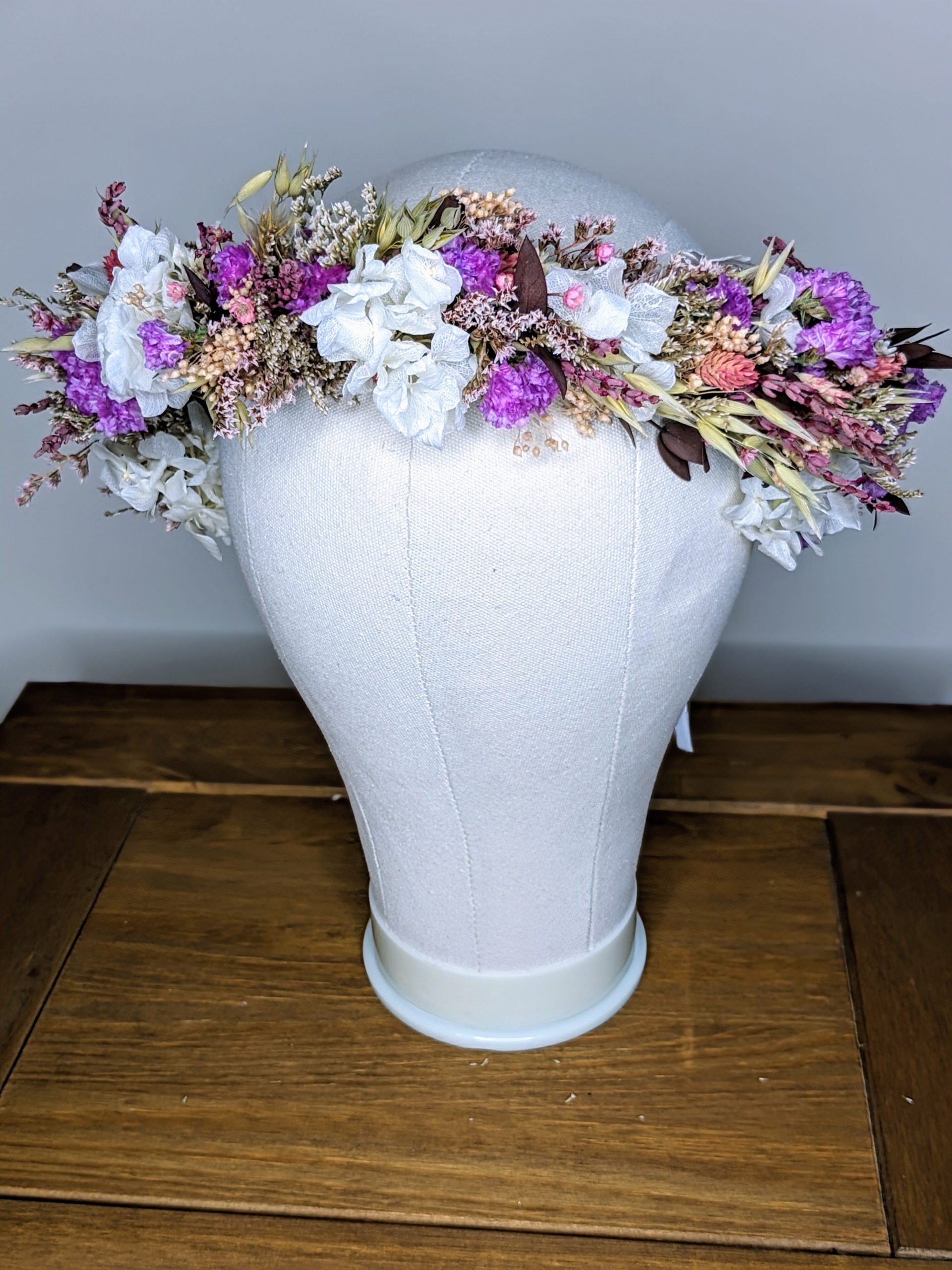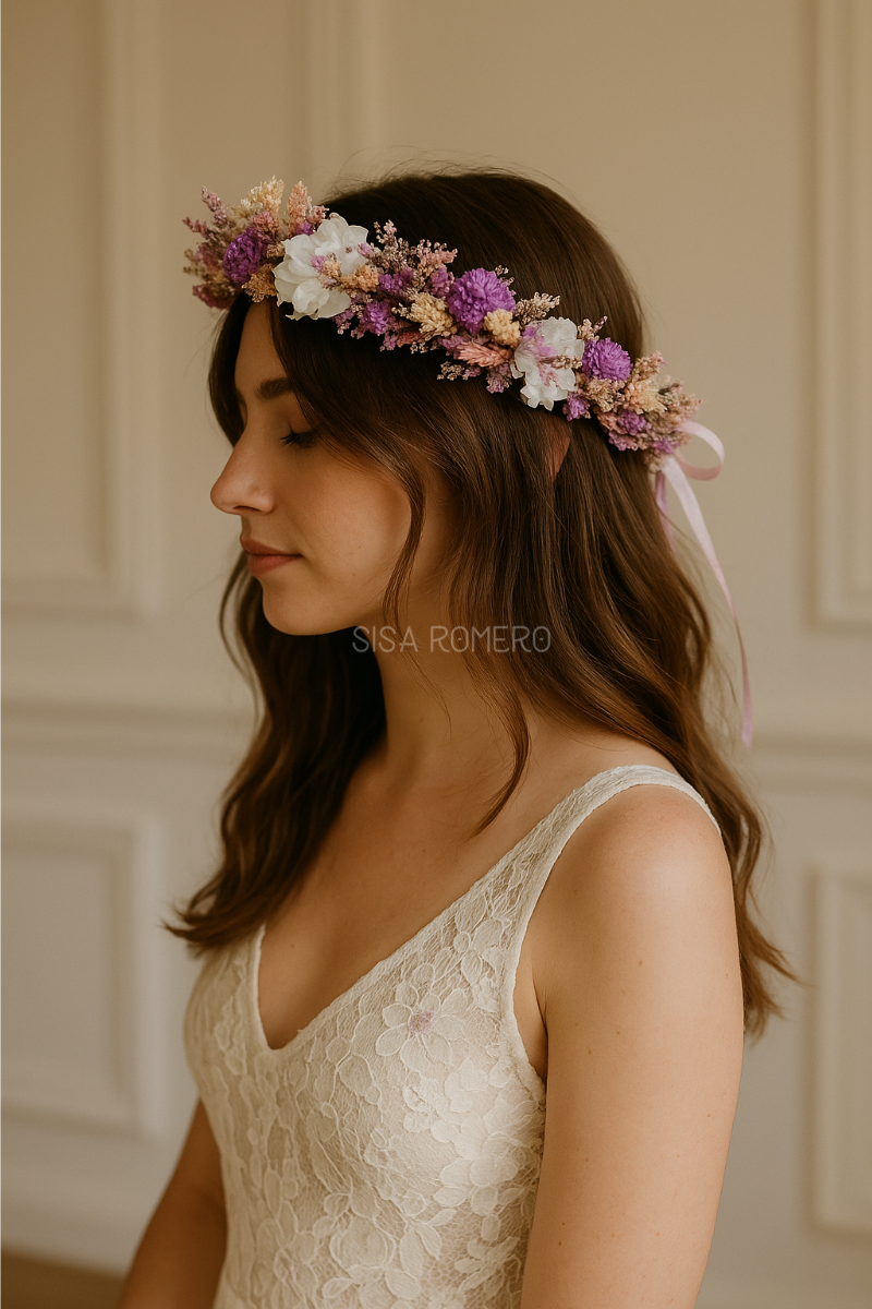 Nuestra corona de flores preservadas en blanco, lila y rosa es perfecta para dar un toque romántico y natural a tu look de boda o evento.