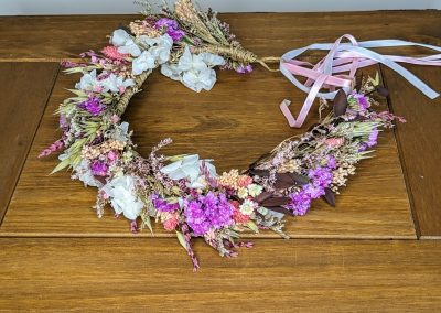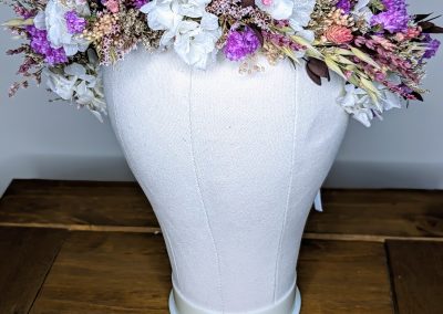 Corona de flores preservadas en tonos blancos, lilas y rosas para novias e invitadas