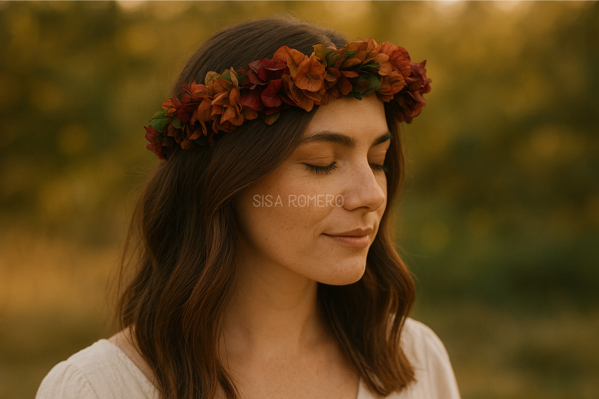 La corona de hortensias preservadas “Otoño” es una pieza única, elaborada artesanalmente con hortensias preservadas en tonos cálidos que evocan la belleza de la estación otoñal. Su combinación de rojos, cremas y verdes ofrece un contraste elegante y sofisticado, perfecto para novias que desean un estilo natural y romántico o para invitadas que buscan un complemento floral especial. Gracias a las flores preservadas, esta corona se mantiene impecable con el paso del tiempo, permitiéndote conservarla como recuerdo. Ligera y cómoda de llevar, es ideal para bodas, sesiones de fotos y eventos al aire libre.